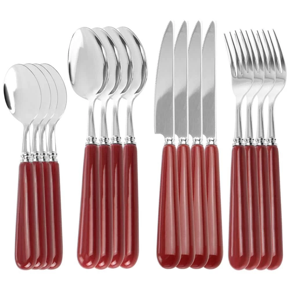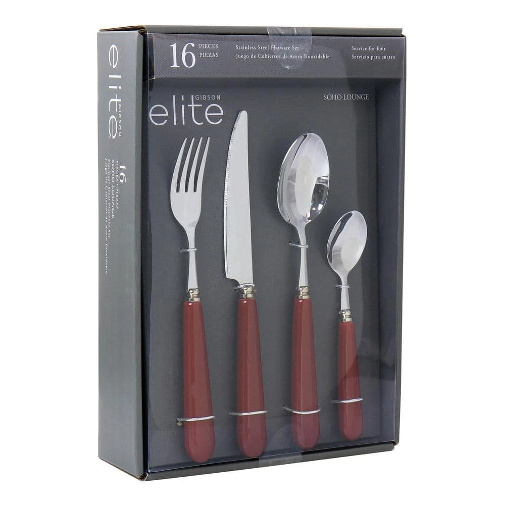 The Gibson Elite Soho Lounge Flatware Set comes with flatware service for 4-people. Add a pop of color to your table with this set. The Gibson Elite collection is constructed with quality durable materials for long lasting use. The smooth thick handles are ergonomic for a comfortable grip and have a beautiful glossy finish. Set comes with 4-dinner forks, 4-dinner knives, 4-dinner spoons, and 4-teaspoons. Hand wash only with mild soap and dry immediately.