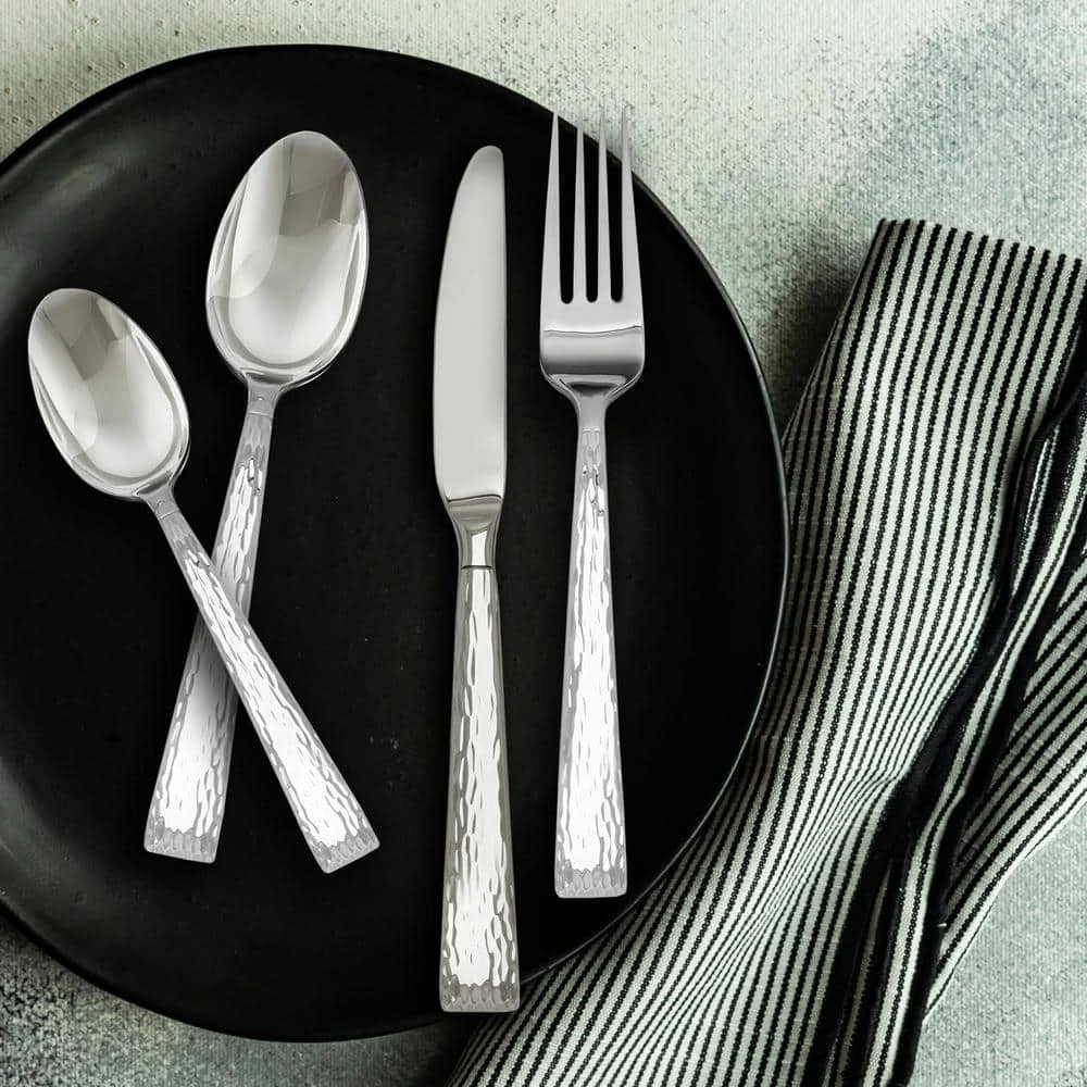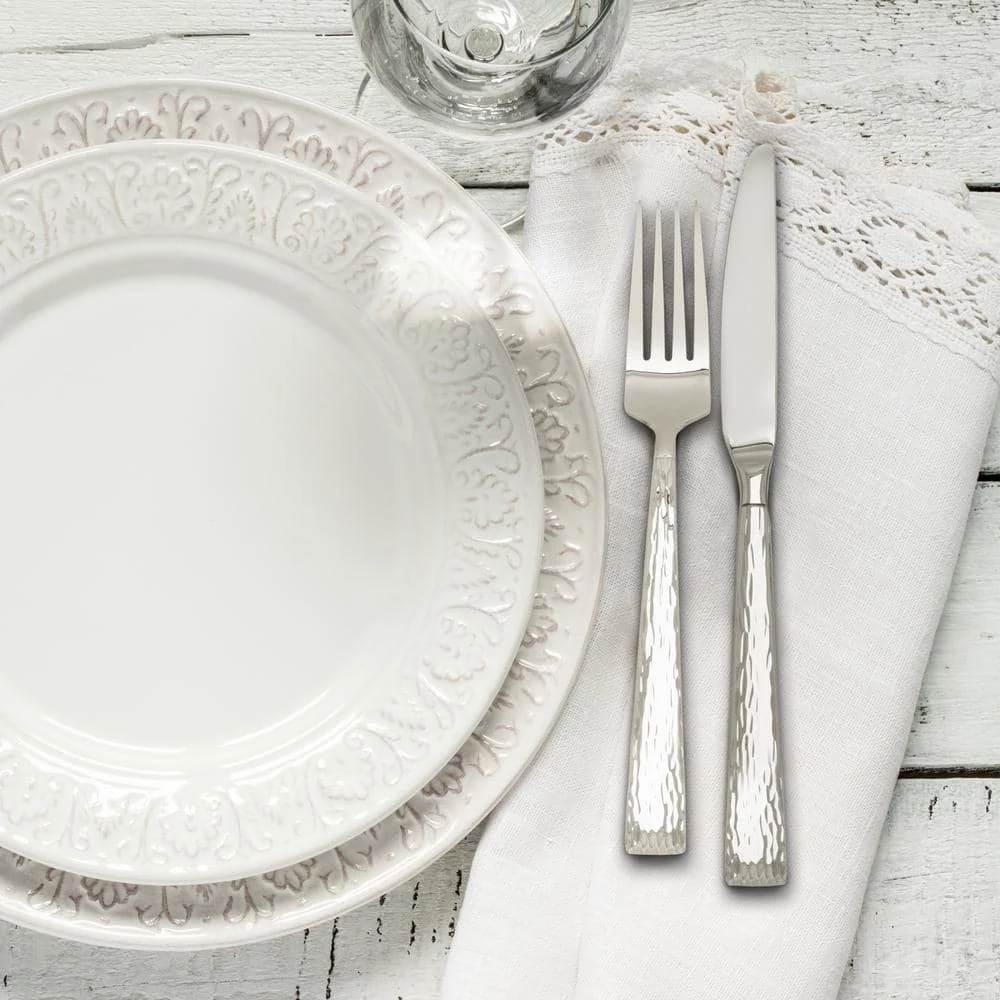 Add a flicker of fun to your tabletop with the Brocade Hammered Flatware Set by HAMPTON SIGNATURE. Delicately hammered textured handles reflect light beautifully, making Brocade an elegant and whimsical statement on any table setting. Great when entertaining as well as for everyday use, Brocade elevates every dining experience.
