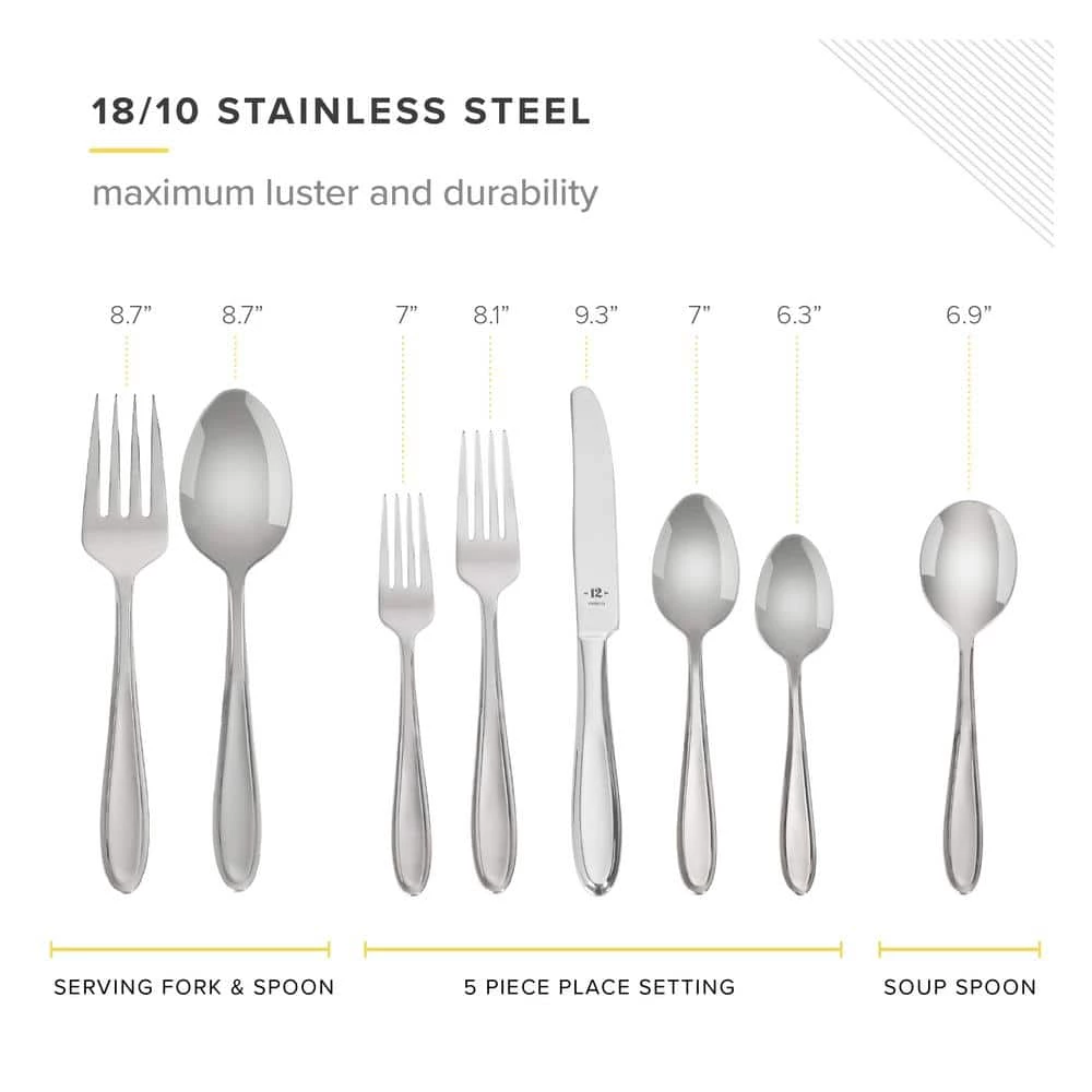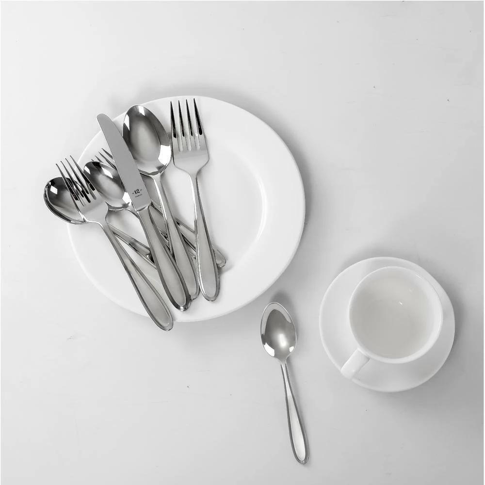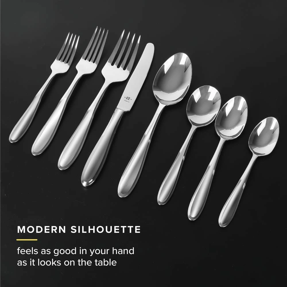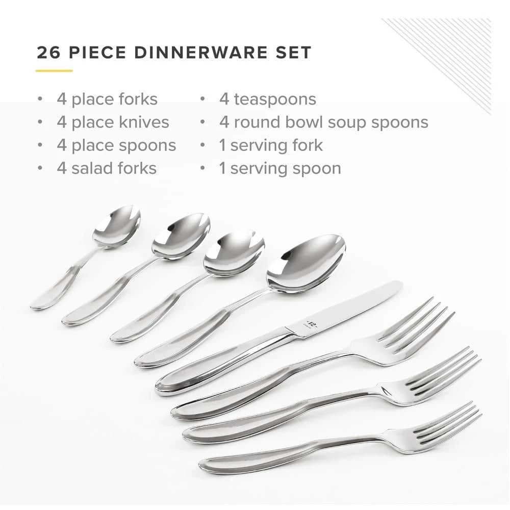 TABLE 12 26-Piece 18/10 Stainless Steel Flatware Set with soft faceted design. Service for 4. Our round edge silverware set is clean and modern, making it an essential addition to any kitchen and new apartment. Perfect for hosting gatherings, dinner with friends or everyday use.