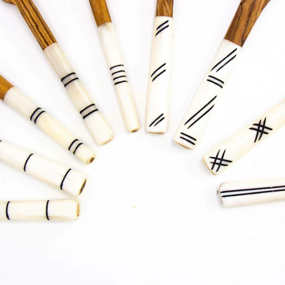 Handmade by artisans in Kenya using traditional methods passed down through the generations, these olive wood and batik handle serving utensils are a beautiful accessory to your appetizer trays or bar area. Product Features: Hand carved and hand-painted. No two are identical. Naturally water and stain resistant. Hand wash and air dry. Socially responsible goods that is empowering to consumers to purchase according to their values and help alleviate poverty. Fair trade is so much more than a product assortment. It’s about safe workplaces, fair wages + community investment for factory employees. Made from wood and ethically sourced animal bones that would have otherwise been discarded. Each piece is approximately 6 to 7-inches long. Story Behind the Art: The bone is “batiked” which is an age old art process used in Africa. The patterns are applied by placing wax on the white bone and dipping the bone into a dark brown/black dye, resulting in the beautiful African mud cloth designs.