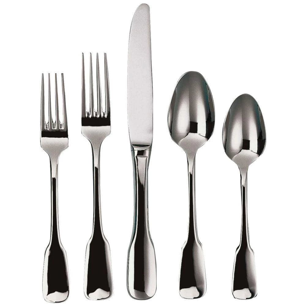 A classic 18th century fiddleback design with excellent weight and quality detail. A full mirror finish. Dishwasher safe.