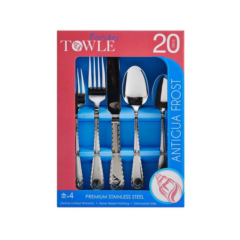 This Towle Everyday Antigua Flatware Set features a different shell design on each handle and captures the simplistic beauty of our natural surroundings. Quality crafted of 18/0 stainless steel, this set will stand up the the rigors of everyday use. This 20 piece flatware set, service for four, includes (4) each: dinner fork, salad fork, dinner knife, dinner spoon and teaspoon. Dishwasher safe.
