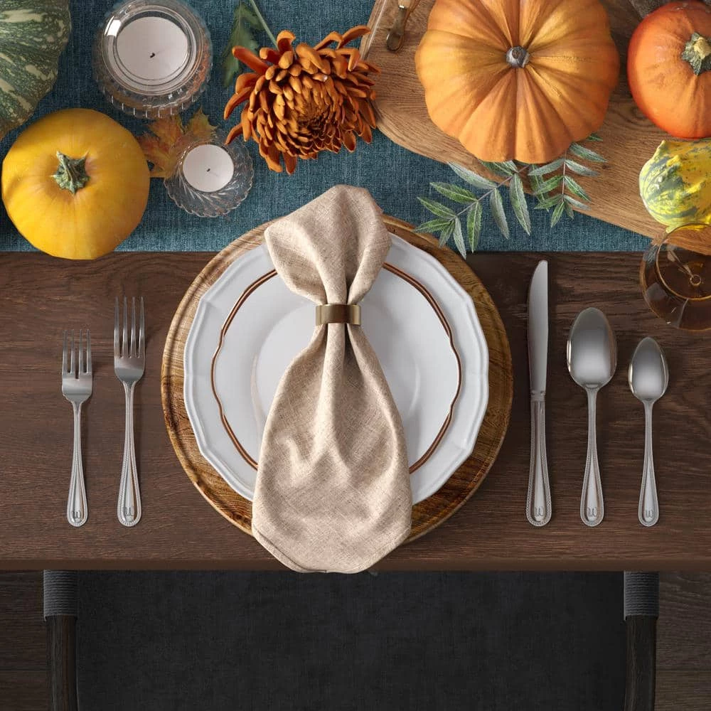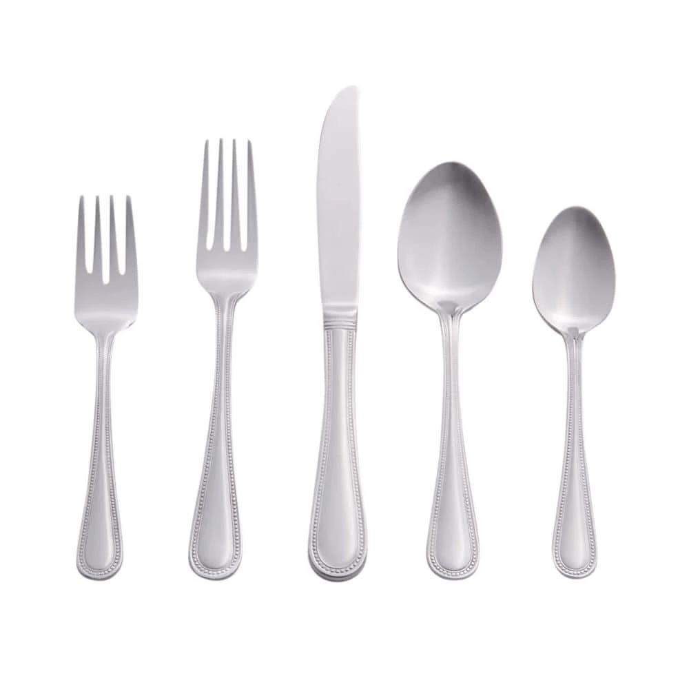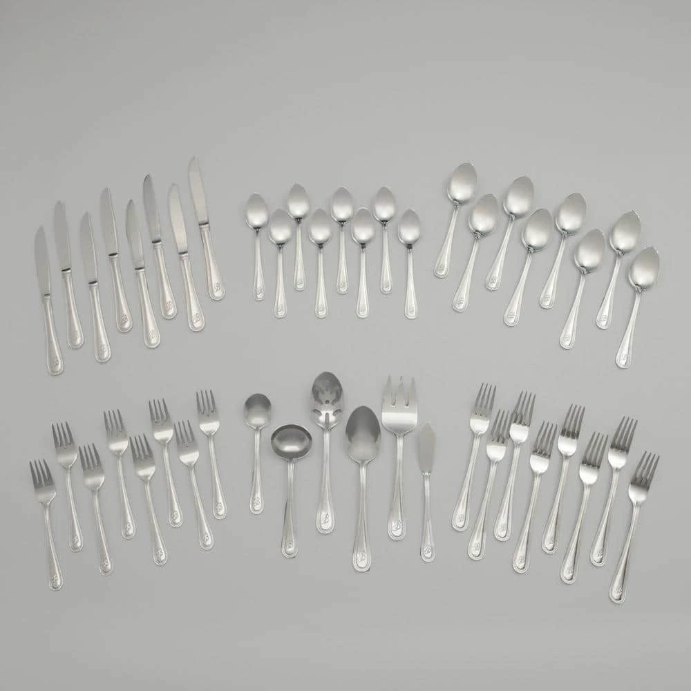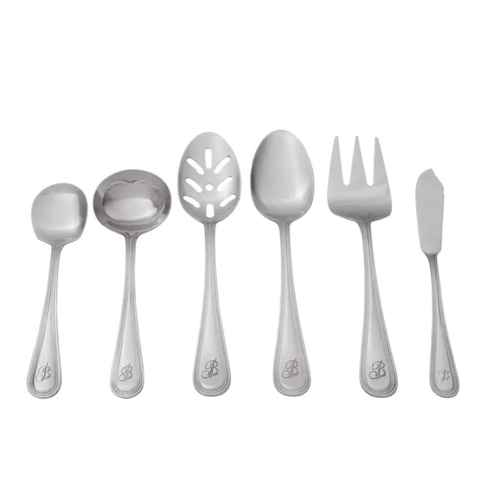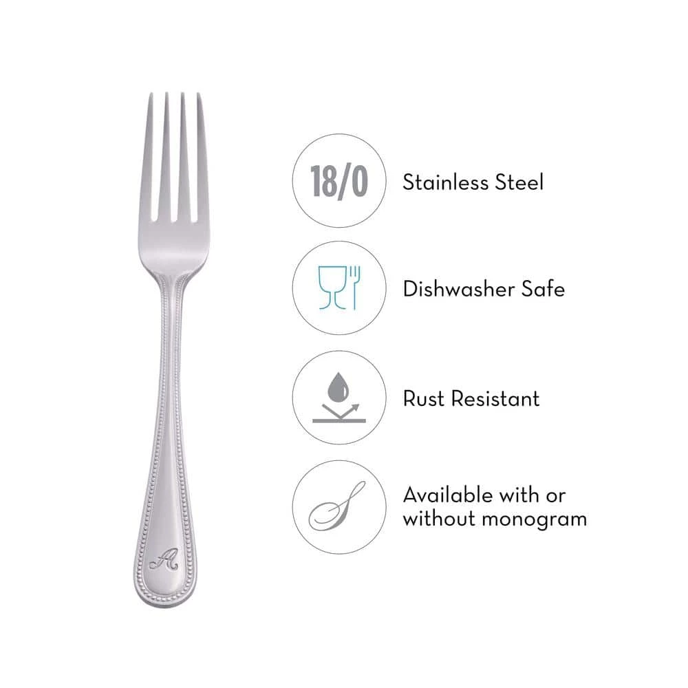Impress family and dinner guests with a personalized flatware set. Each piece is permanently stamped with the letter of your choice. Classic and versatile beaded design will coordinate with any table setting. This 46 piece set contains the following: 8 dinner forks, 8 dinner spoons, 8 salad forks, 8 teaspoons, 8 dinner knives, 1 serving spoon, 1 slotted serving spoon, 1 gravy ladle, 1 serving fork, 1 butter knife and 1 sugar spoon.