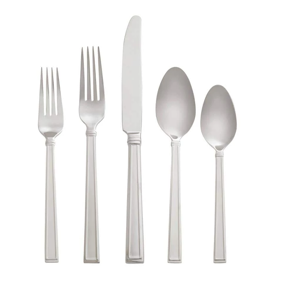 Classic look of this expanded flatware set goes from casual to formal settings. The handles are ribbed with grooves from the base to the ends. The ends have an architectual curved design. Service for 12, this set includes: 12 Place Knives, 12 Place forks, 12 Place Spoons, 12 Salad forks, 12 tea spoons, 12 Steak knives, 12 Sporks, 12 Iced Beve Spoons, 12 Round Bowl Spoon Spoons and (1) ONE each: Serving fork, Serving Spoon, Pierced Serving Spoon & gravy Ladle.