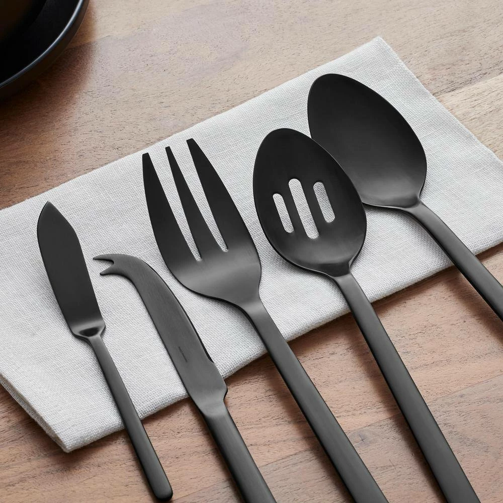For trend setting flatware worthy of the finest table, look no further than our elegant 5-piece Stainless Steel Serveware Set in the Matte Black finish. Our hand-crafted style and high quality material will elevate your tableware fare to a new level. The 5 piece set includes 2 serving spoons, 1 serving fork, 1 butter knife and 1 cheese knife. This set is not considered dishwasher safe and must be hand-washed only. Additionally, we recommend that you do not wash this serveware set with any abrasive or acidic cleaning agents and do not soak serveware overnight.