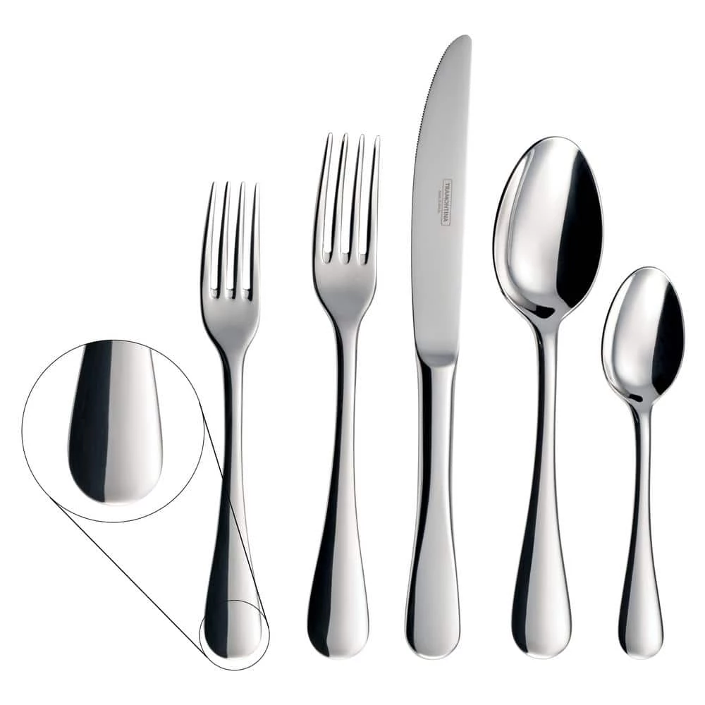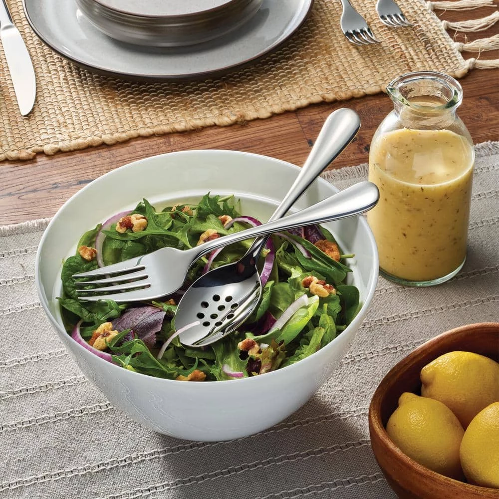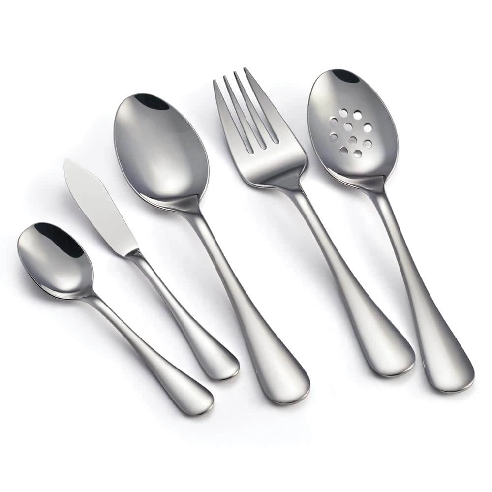 Appropriately named, our Classic Flatware Set forged in heavy 18/10 stainless steel shows off a timeless look to match any table-or occasion. This 45-pieceSet has everything you need to set a table for eight and serving utensils that match. Made with the quality you’ve come to expect from us, the Classic set stands out, thanks to the elegant teardrop-shaped edges that decorate the pieces. Symmetrical spoons, forks crafted for the mouth with polished tines on the inside, and serrated dinner knives built for solid durability create a flatware set that can stand up to even the busiest table.