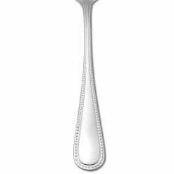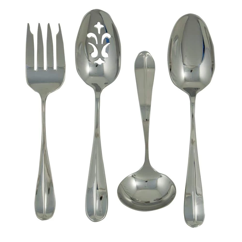 Classic English 4 piece Hostess set contains 1 each serving spoon, pierced serving spoon, meat fork, and sauce ladle. Deep ridged handles and contoured bolsters with distinctive paddle shaped knife blades are all characteristics of 18th century flatware. This pattern is a direct reproduction of a handmade sterling pattern. Hot stamped to allow for the narrow, deeply arched neck, and raised ridge on the handles center.