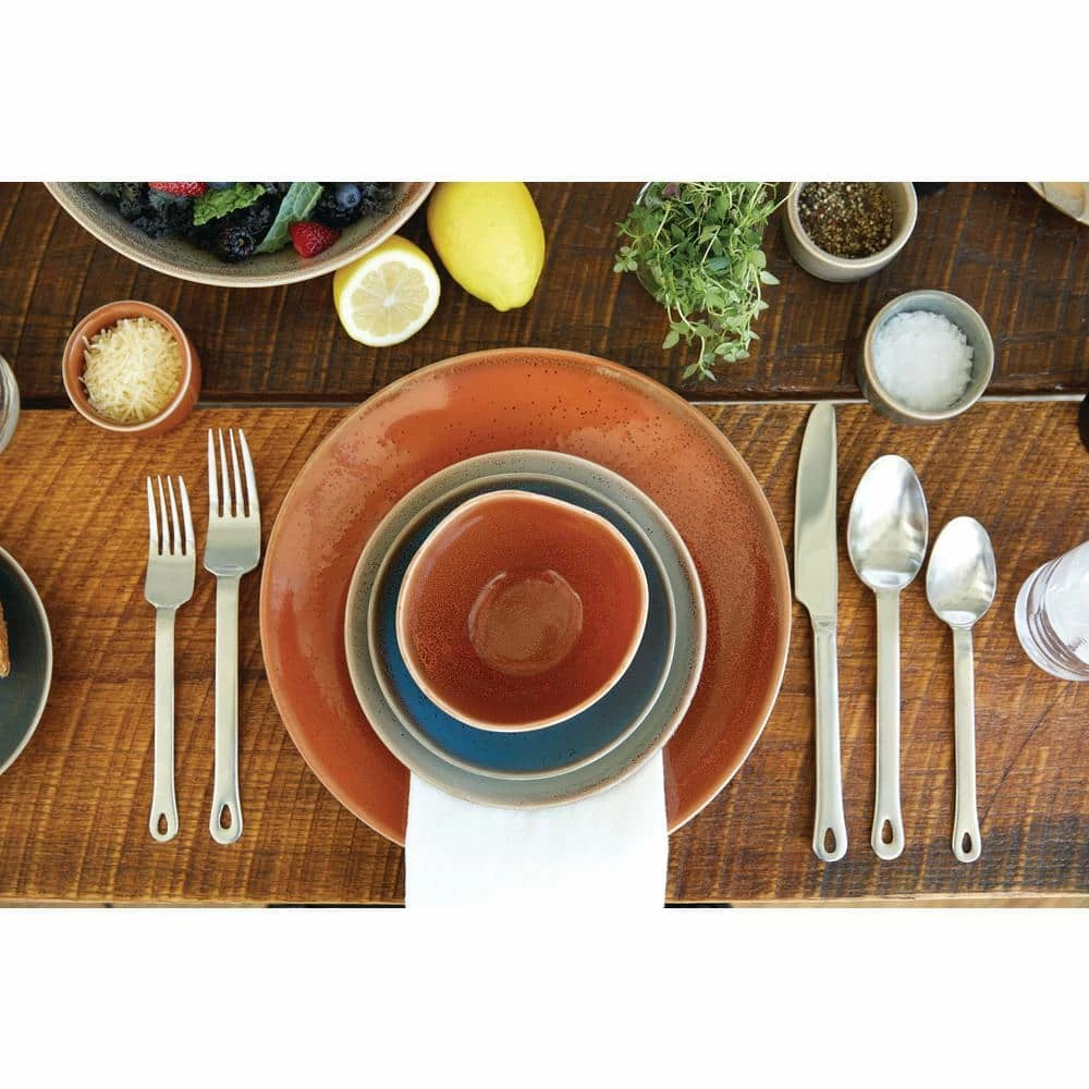 Inspired by the farm-to-table trend, Cooper features an open hole handle and brushed finish. The clever design that resembles classic riveted cookware will complement any casual table setting. This flatware set is made of 18/10 Stainless Steel and is dishwasher safe.