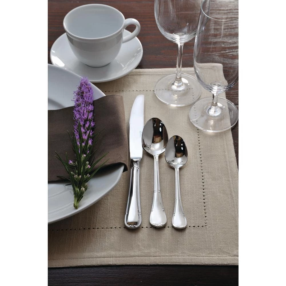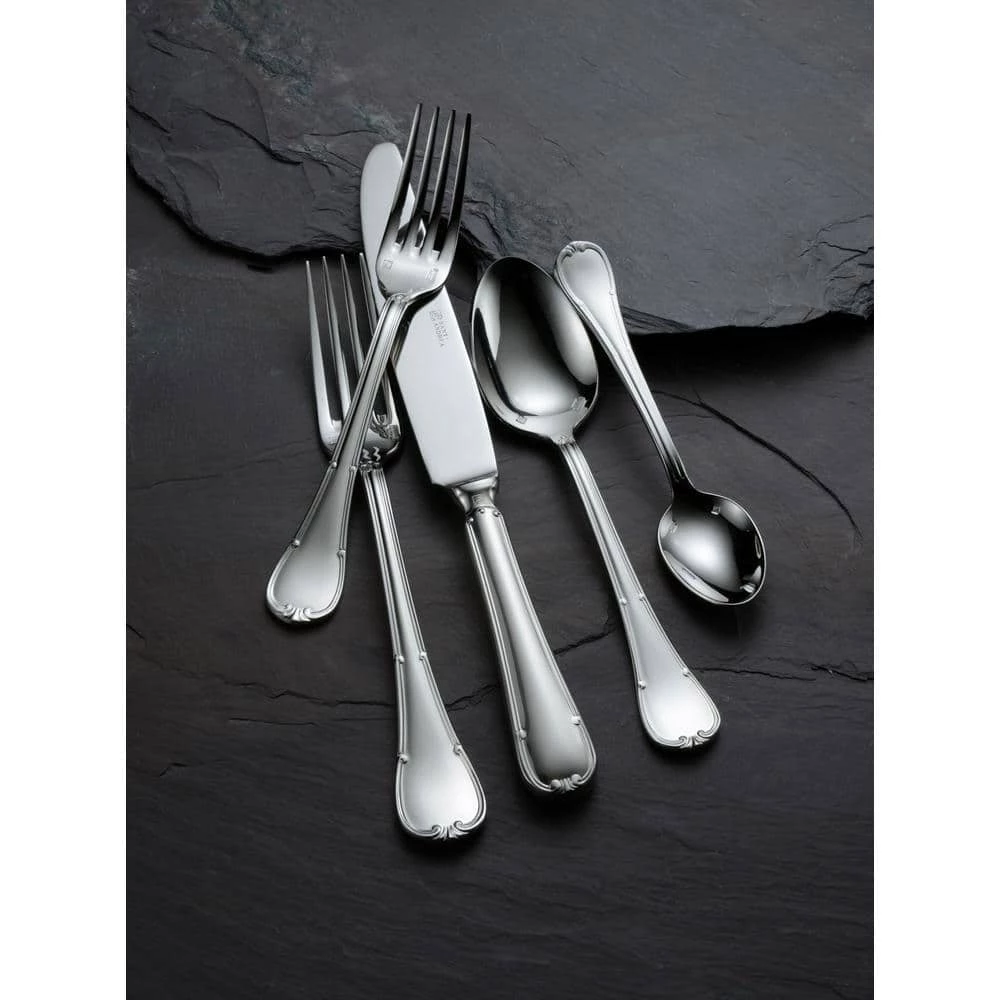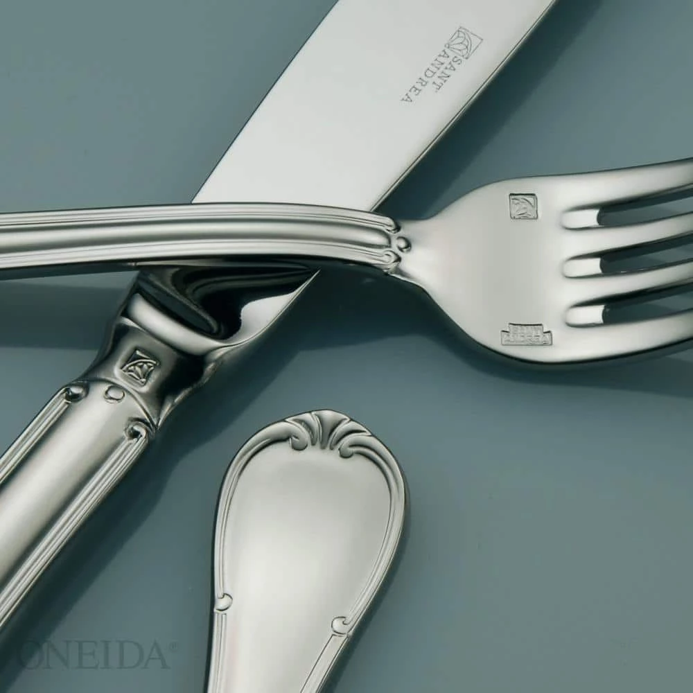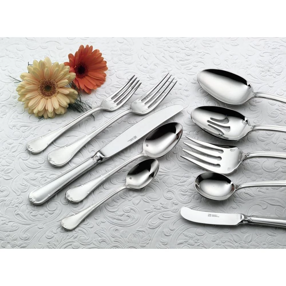 Styled in classic European tradition, Donizetti delivers the finest 18/10 stainless on a timeless shape. This elite pattern celebrates a delicate, scrolled border that culminates in a majestic crown. This flatware set is made of 18/10 Stainless Steel and is dishwasher safe.