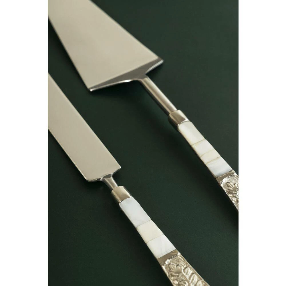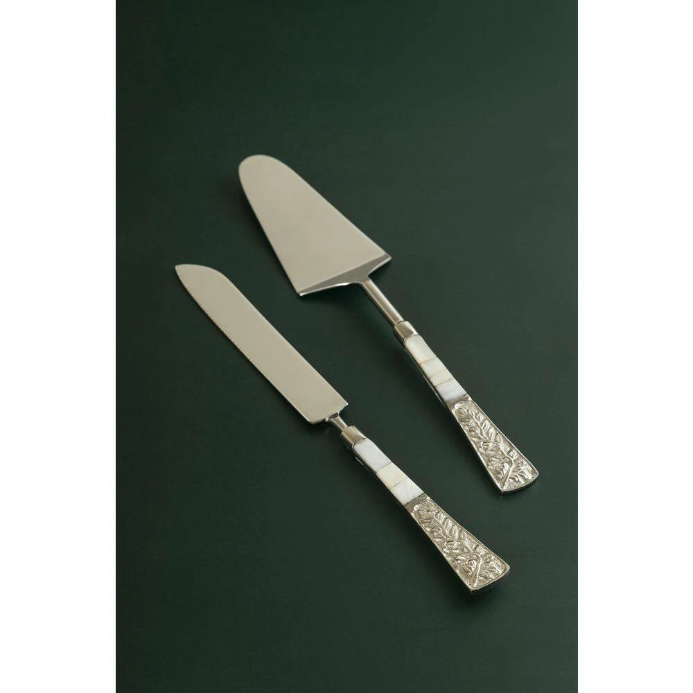 This pair of cake knife and server are of made high quality, ethically sourced and polished mother of pearl shells and high grade stainless steel having a natural rustic look. Both the cake knife and server feature silver-plated handles with a raised floral design. Hand craftsmanship and natural variations in the color, weight and veining of natural mother of pearl shells makes each of our cake servers a singular work of art.