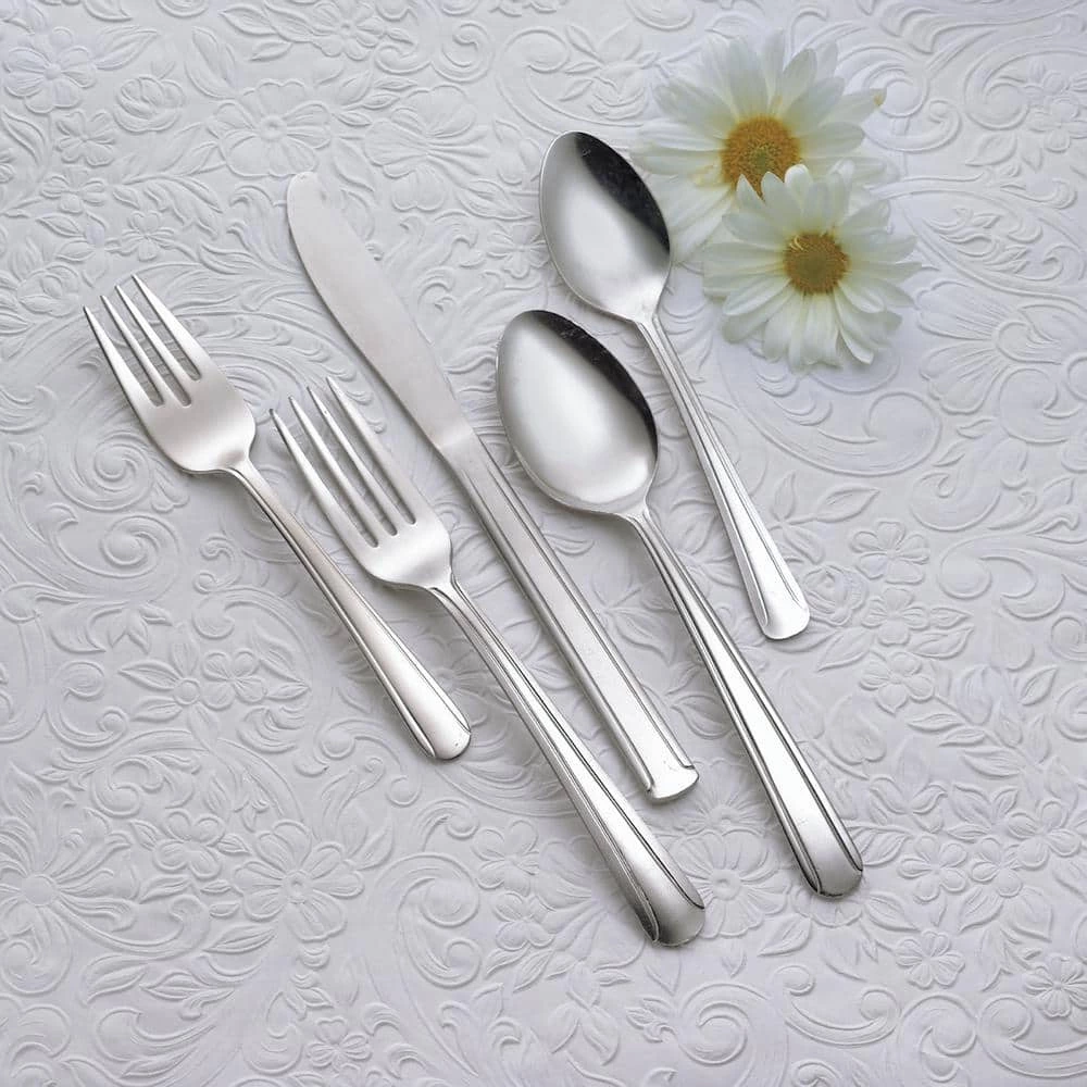 This design boasts a pair of prominent lines flowing down the middle creating a pleasing paneled effect. The brightly polished handle tapers at the shank bringing balance to this casual pattern. This flatware set is made of 18/0 Stainless Steel and is dishwasher safe.