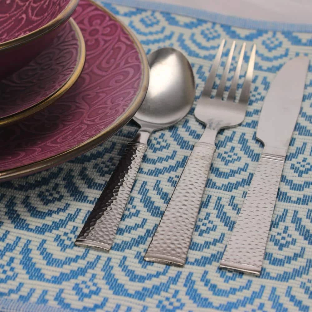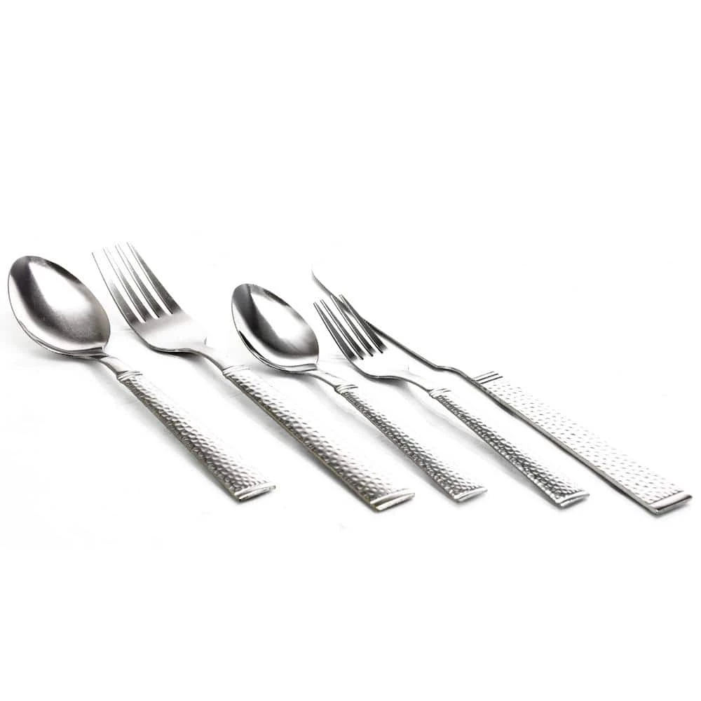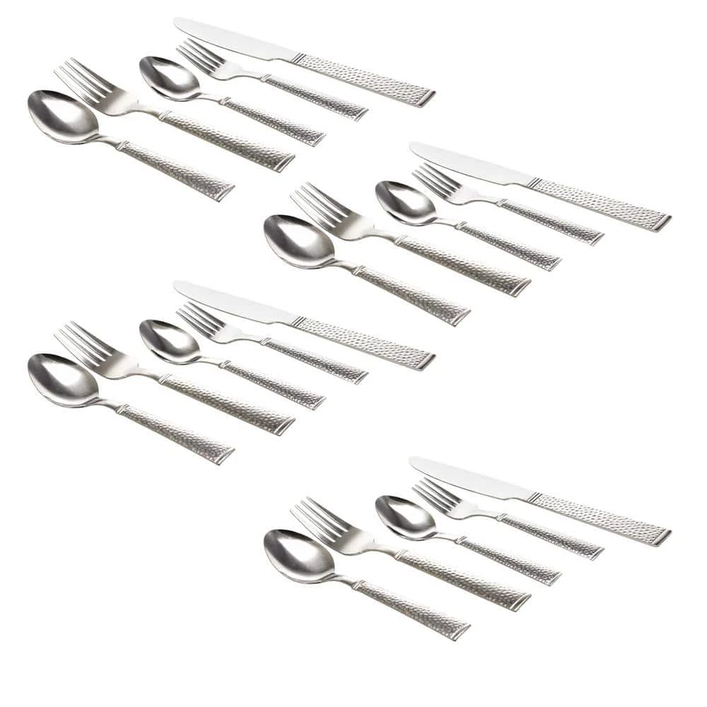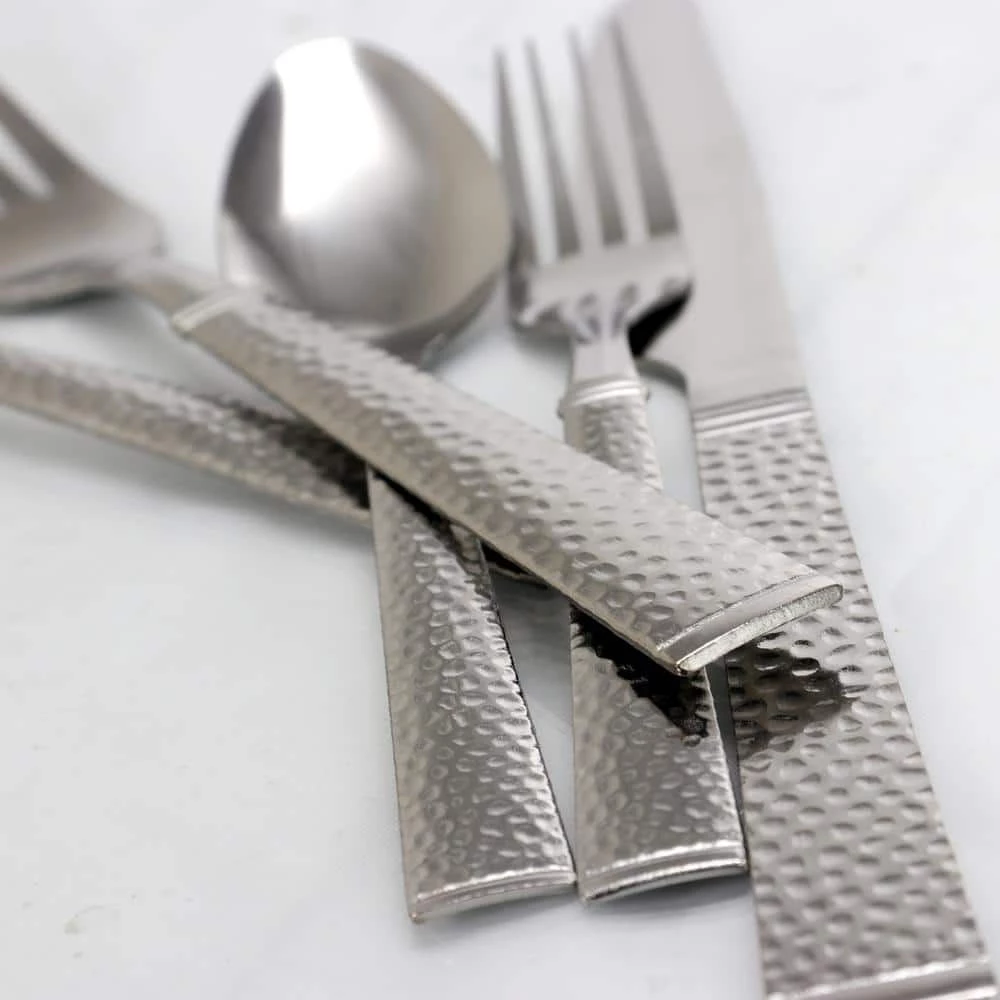 he Gibson 20 piece flatware set is a must have for any house hold. The set is complete for 4. The set is light weight and can be used every day. The set is complete for when you have guests over, or just when you come home and just want to have a bowl of cereal. The sets handles are hammered texture which makes for grip. The set includes 4 of each of salad forks, dinner forks, dinner knives, dinner spoons and teaspoons. The set is in stainless steel.