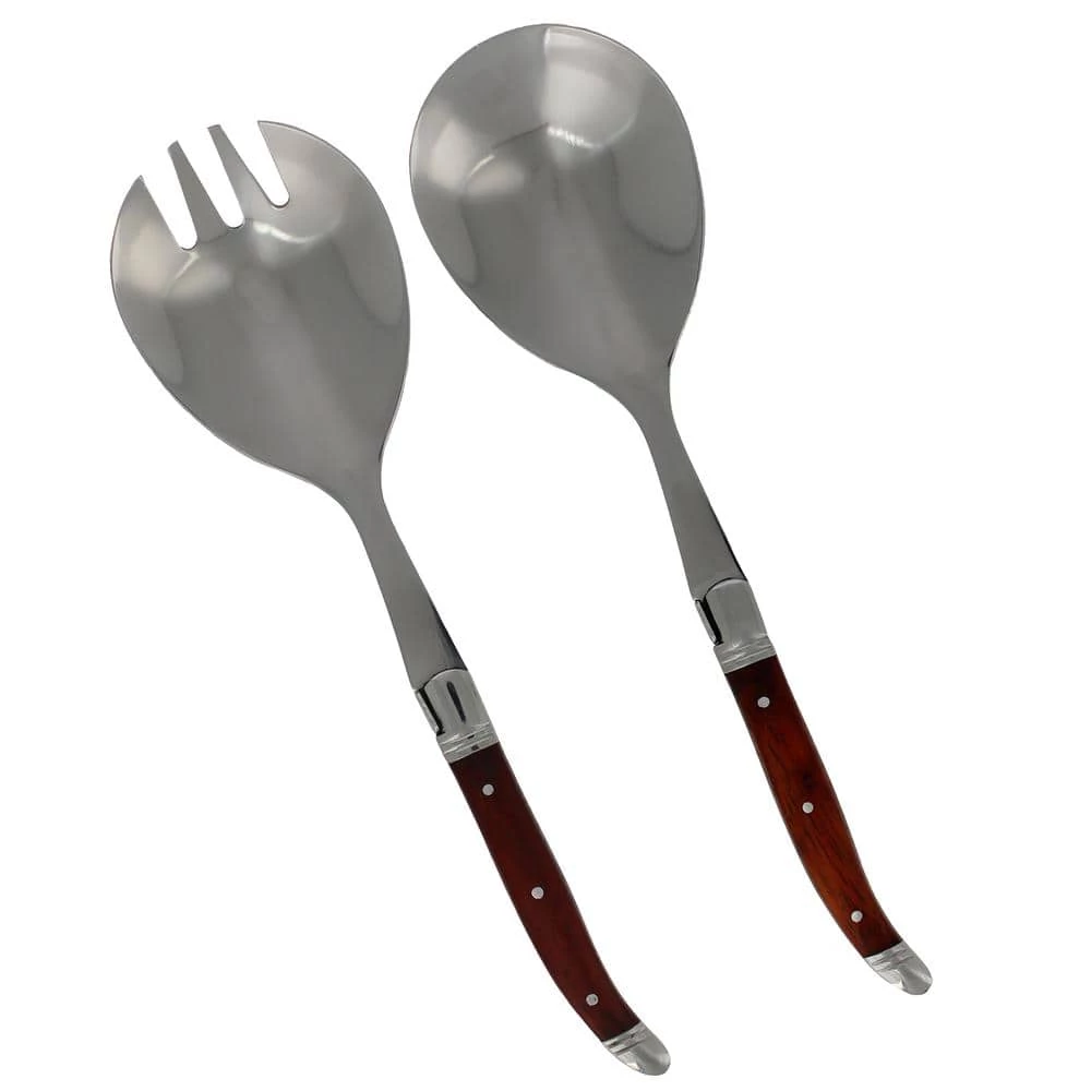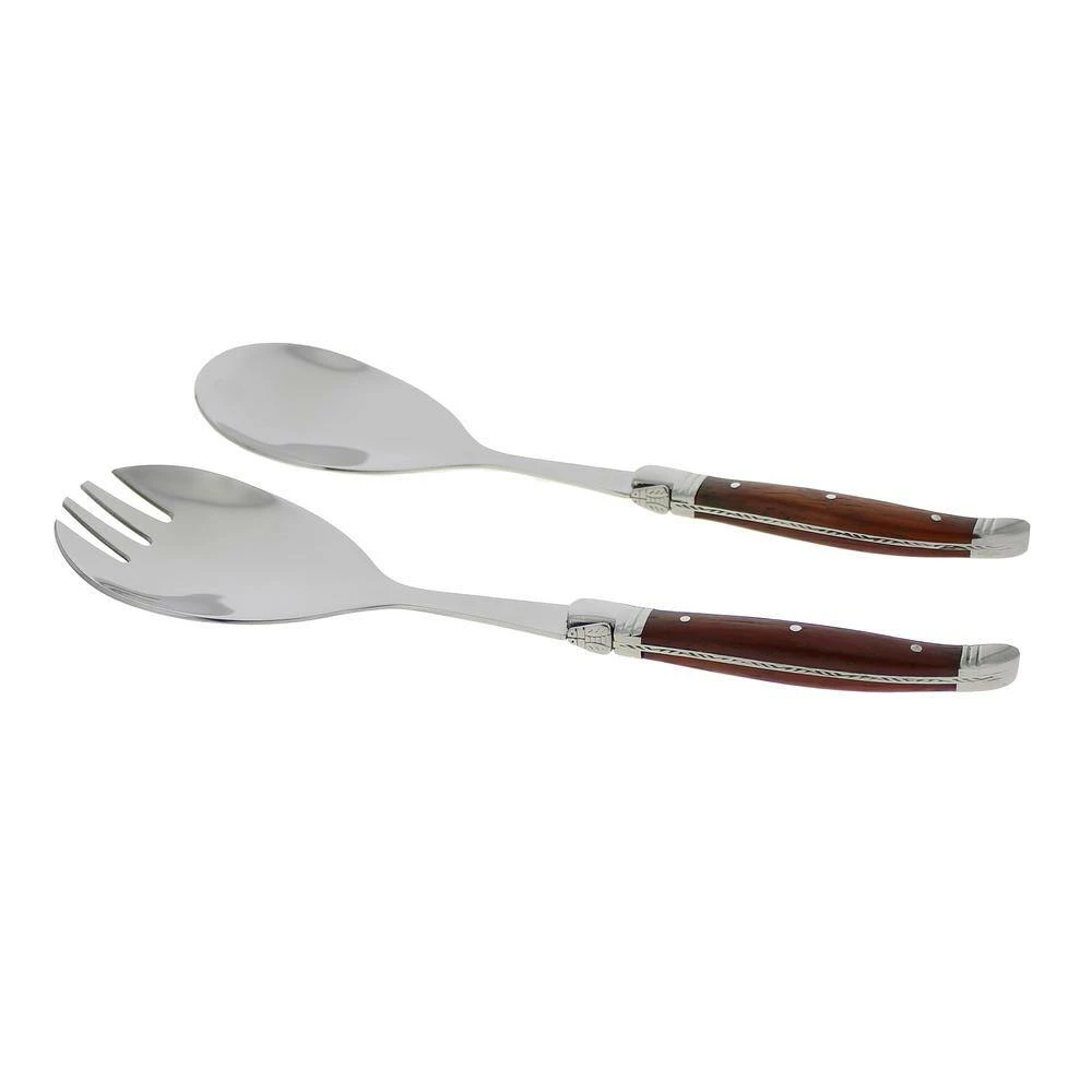 French Home’s traditional and elegant Laguiole Salad Servers with the iconic three Rivet curved handle and Bee emblem is comfortable to hold and the large size is perfect for serving. The distinctive style will complement your table whether you are having a formal dinner or a casual meal and can be a great addition to any flatware set. Serve your salads with style and flair with this pair of 10.5 in. L x 3 in. W stainless steel salad spoon and salad fork with beautiful rosewood handles. Laguiole is a town in France where this style originated. They come in an attractive box making them the perfect wedding, host or everyday gift. Hand washing recommended.