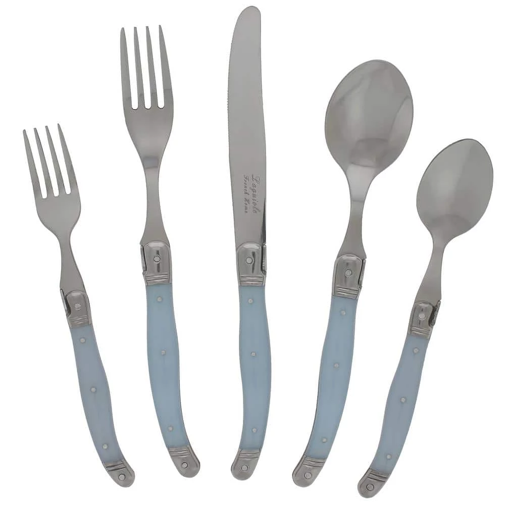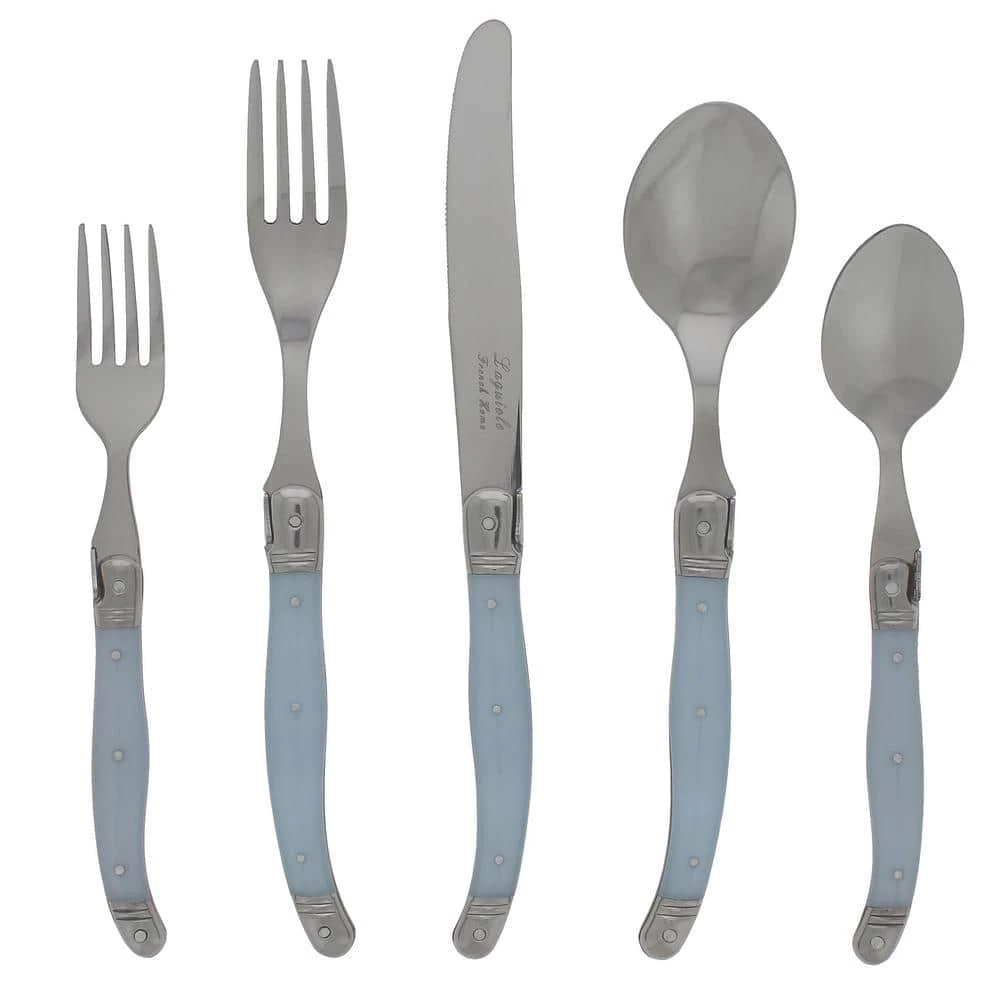 French Home’s traditional and elegant Laguiole design with the iconic three rivet curved handle and Bee emblem is comfortable to hold and perfectly balanced. Ideal for casual or formal dining, the fully tanged 20-piece stainless steel set has Ice Blue handles and is dishwasher safe. Laguiole is a town in France where this style of cutlery originated in the 1820’s. Set includes four 9.25 in. dinner knives, four 8.5 in. dinner forks, four 8.25 in. soup spoons, four 7.25 in. salad forks and four 7.25 in. dessert spoons.