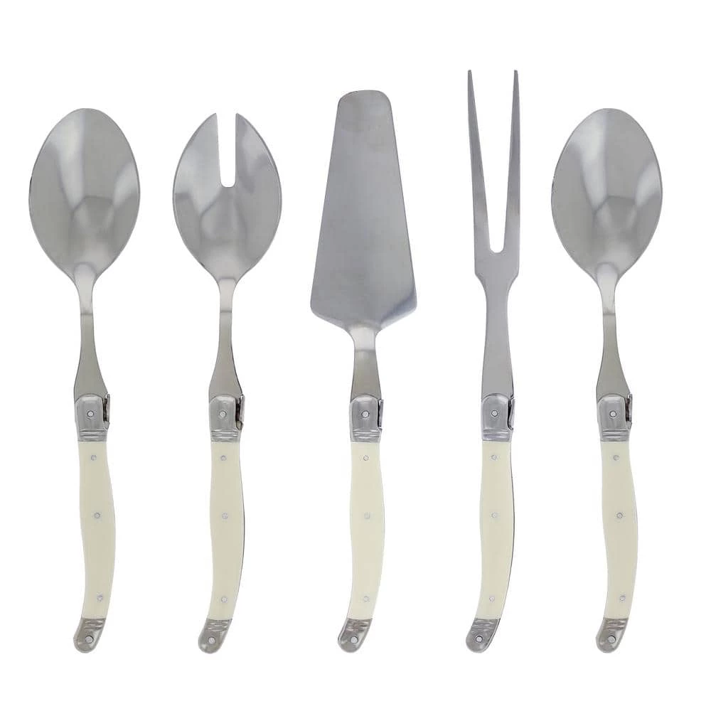 French Home’s essential 5-piece Laguiole Hostess Serving set is a must for every occasion! The Iconic three rivet curved handles are comfortable to hold and with the traditional bee emblem and etched spine is a stylish way to serve all your scrumptious culinary creations. The distinctive style will complement your buffet table for a formal holiday dinner or casual family meal. Includes two serving spoons, a slotted serving spoon, a serving fork and a pie server. All 9.5 in. Long and 2 in. Wide, the perfect size. Made of high-quality stainless steel and faux ivory handles our utensils are dishwasher safe making our hostess set practical for today’s busy lifestyles. Laguiole is a town in France where this style originated in the 1820’s. The set comes in an attractive box ideal for storage and making them the perfect wedding, hostess or everyday gift. The way to entertain.