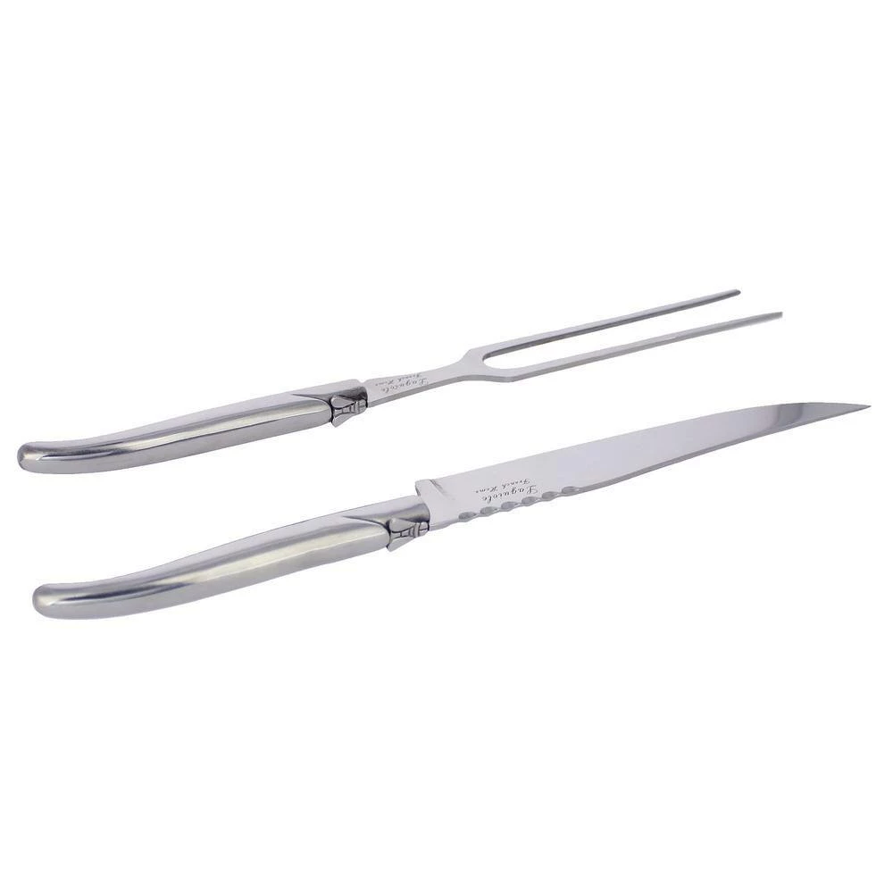 Carve your delicious roasts with French Home’s stainless steel Laguiole carving set. The curved handle, offering a comfortable grip, and the iconic bee emblem signify the traditional French Laguiole design. Whether carving in the kitchen or at the festive holiday table this knife and fork carving set adds elegance to the dining experience. An attractive-box is perfect for storage and gift giving. Laguiole is a town in southern France where this style originated in the 1820’s.
