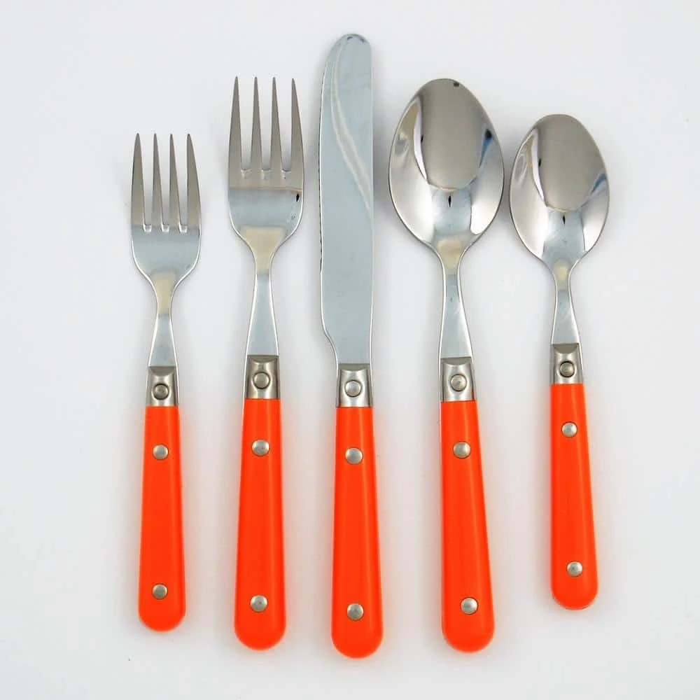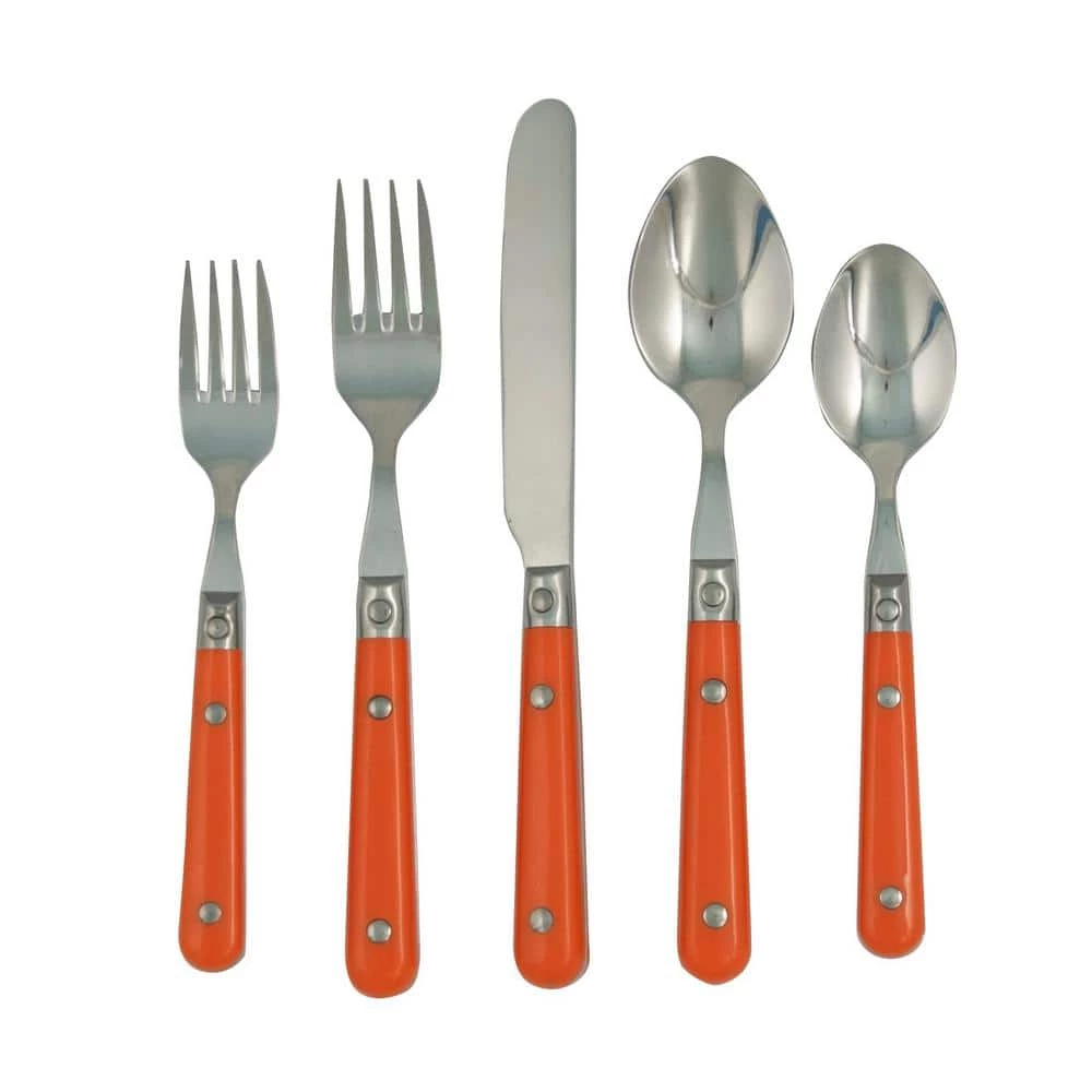 LePrix-Persimmon 20-piece Service for 4. The classic utensil from the fully equipt 1920’s picnic basket has been refined, improved, and updated to the point where it can grace any sunny deck, any beach location or any dining table. Durable, with full steel tang the length of the handle, and which is riveted throughout to securely fasten the colored ABS plastic handles. Capped at the bolster in 18/10 stainless steel. Fully dishwasher safe.