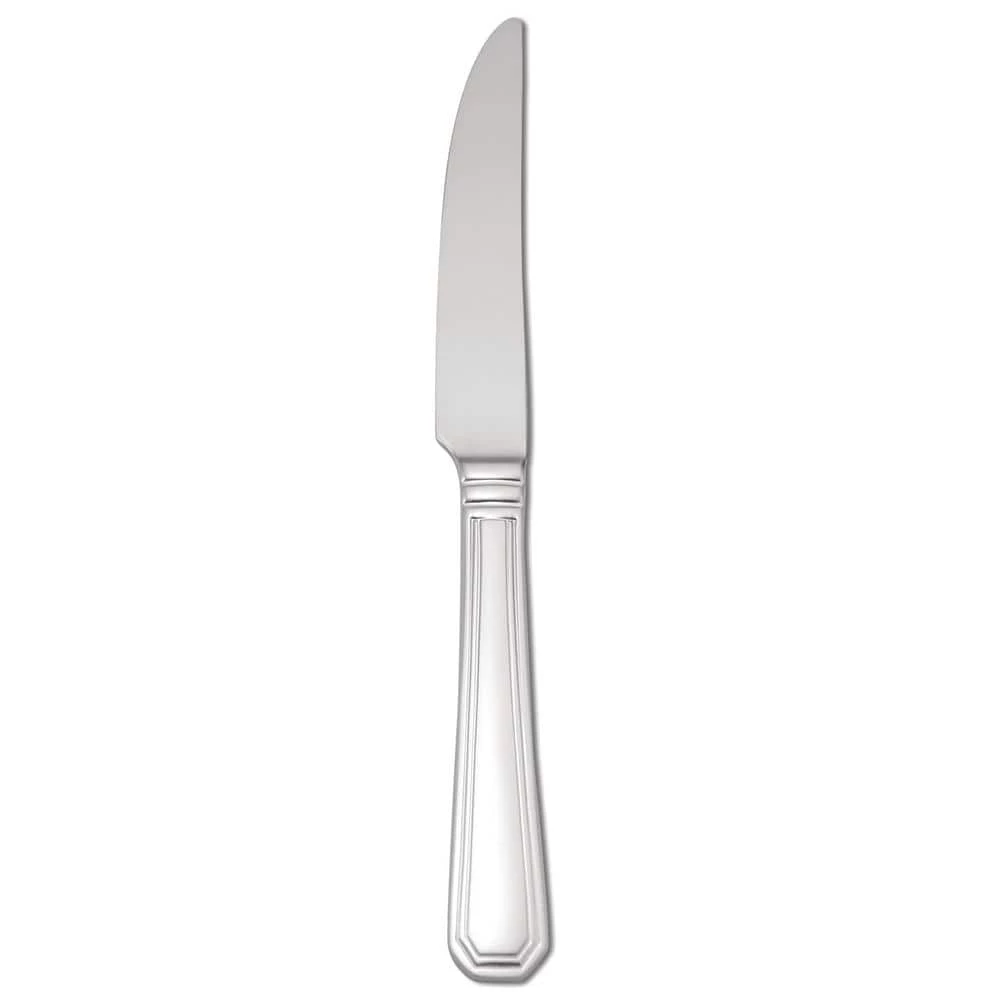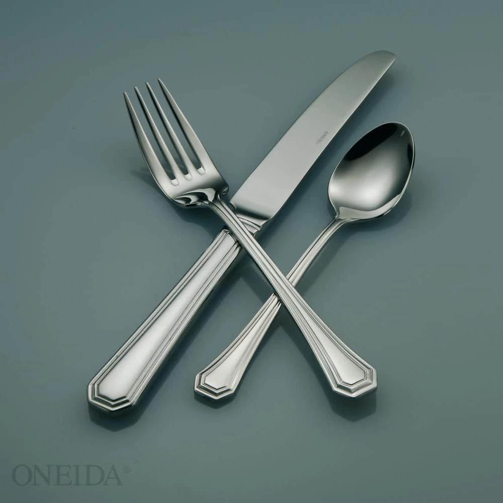 A pair of incised lines echo the perimeter of this luxurious design. The lustrous notched handle brings a contemporary, European flair to your fine dining establishment. This flatware set is made of 18/10 Stainless Steel and is dishwasher safe.