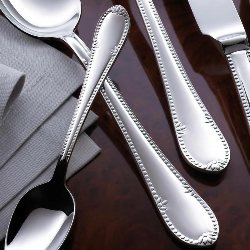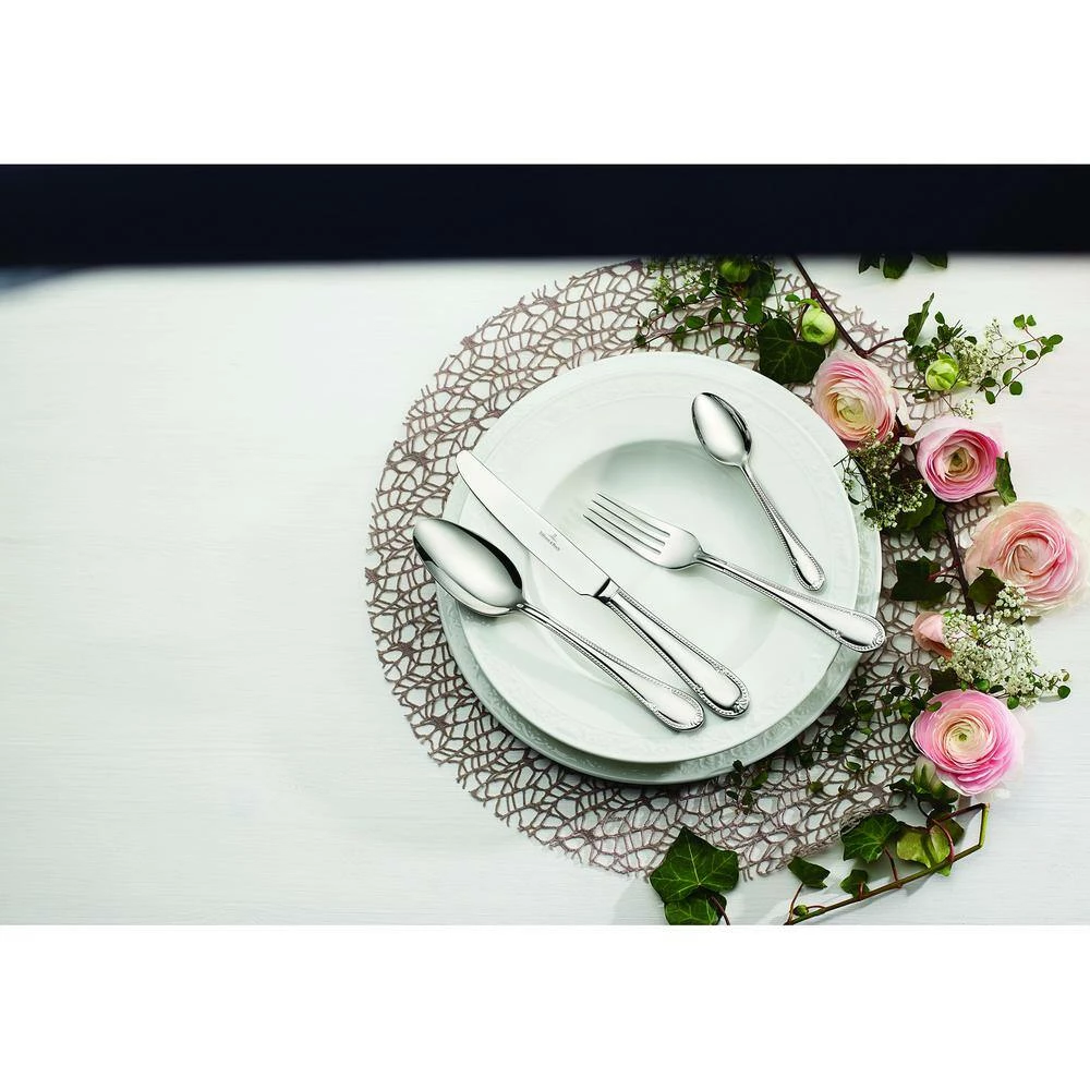 The attractive pearl details add a youthful and fresh feel to the traditional design of the Mademoiselle collection by Villeroy & Boch. The rounded shape makes each individual item feel very comfortable in your hand. The dishwasher safe 18/10 stainless steel flatware with detailed design elements edging the handles creates a striking effect perfect for those desiring a classic look. The 20 piece service for four includes 4 each: Dinner Knife, Dinner Fork, Dinner Spoon, Salad/Dessert Fork and Teaspoon/Dessert Spoon.