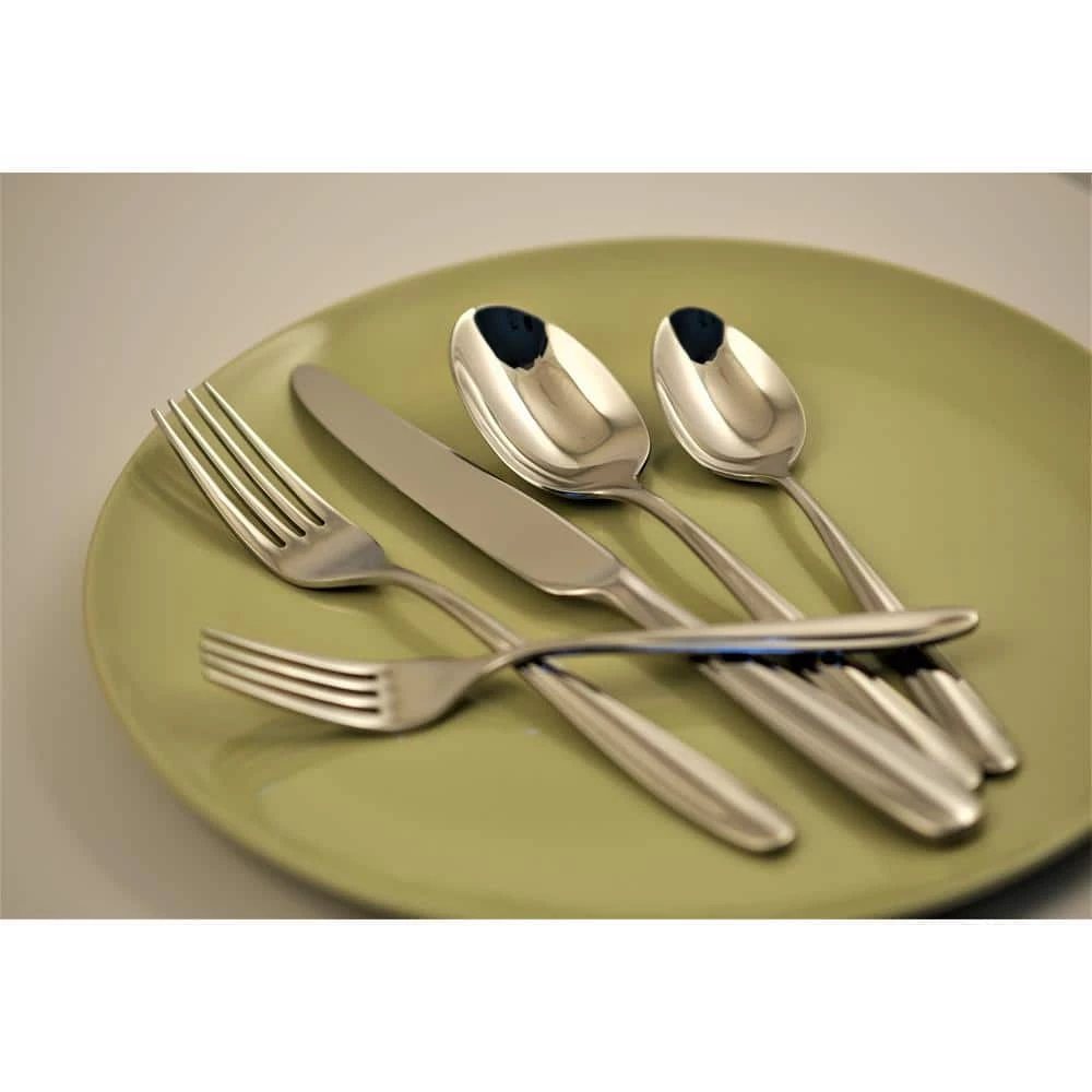 Sleek and Slender with flowing lines that are soft and curved and a delight to hold and use. 4mm 18/10 Stainless stock adds a nice weight and creates the perfect balance. 42-Piece service for 8-contains 8-each: Salad Fork, Dinner Fork, Dinner Knife, Dinner Spoon, Teaspoon, and 2-Serving Spoons.
