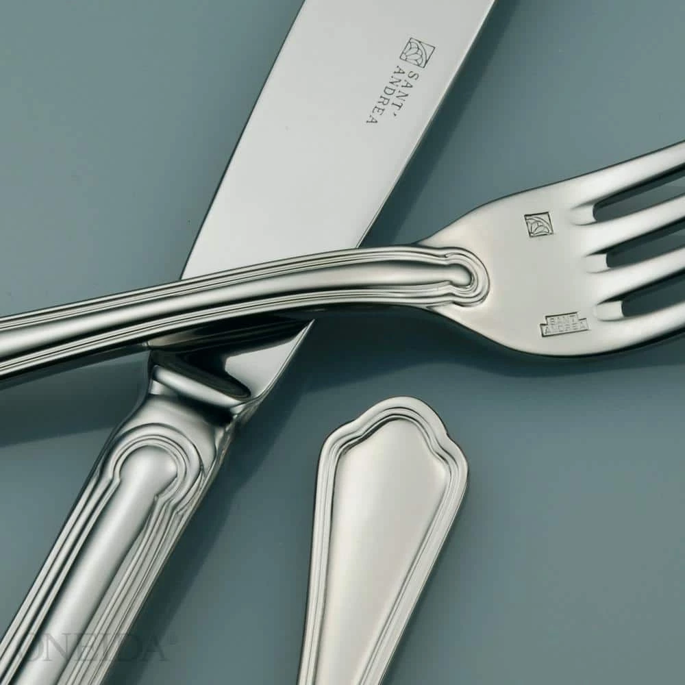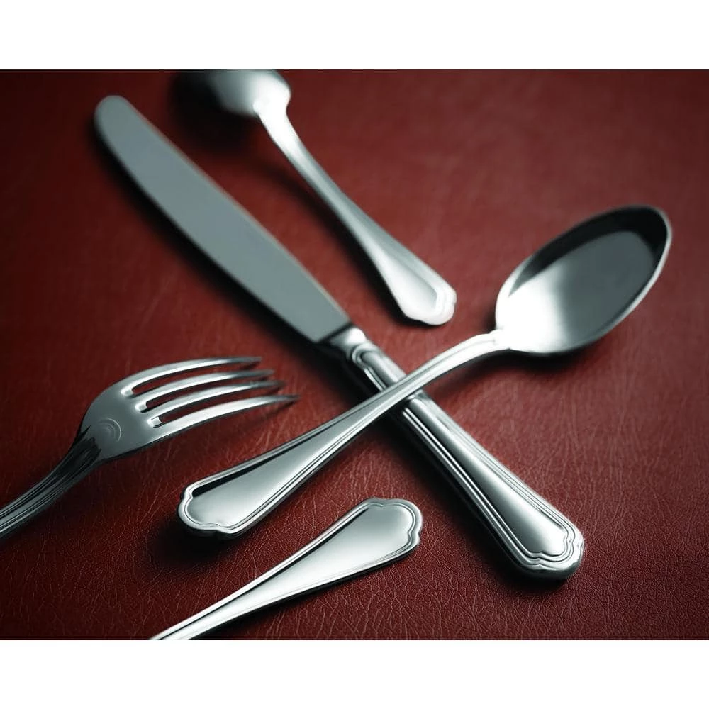 Incised lines along the handle culminate at the tip in a majestic crown detail. This stunning stainless design blends classic European themes with a contemporary sense of style. This flatware set is made of 18/10 Stainless Steel and is dishwasher safe.
