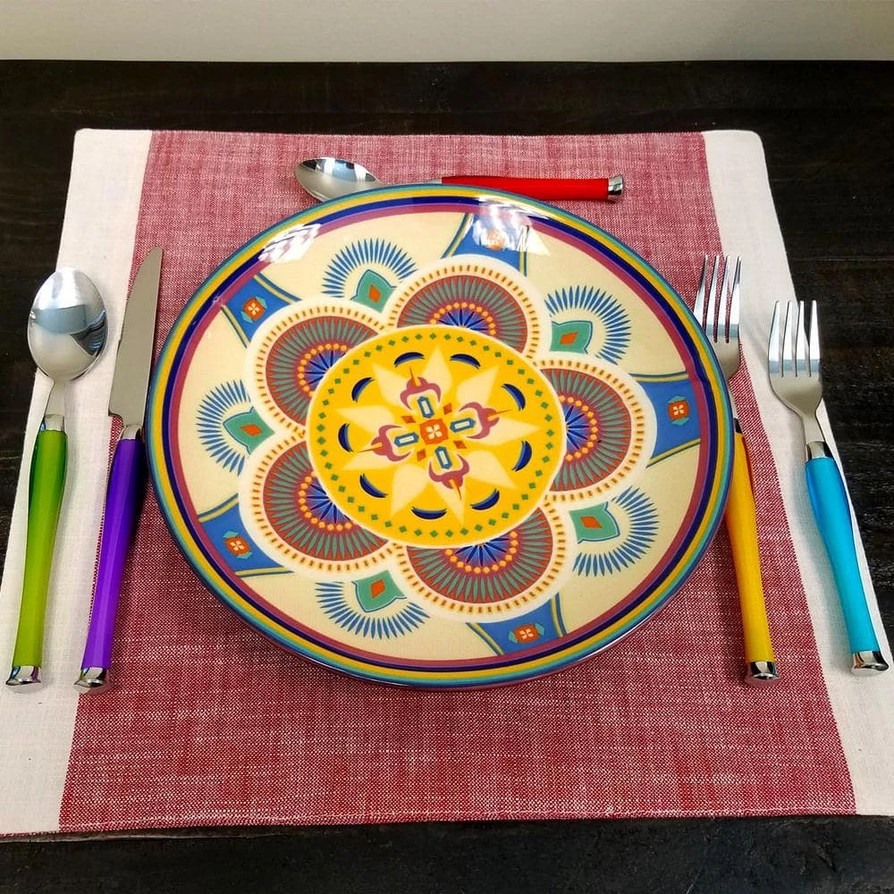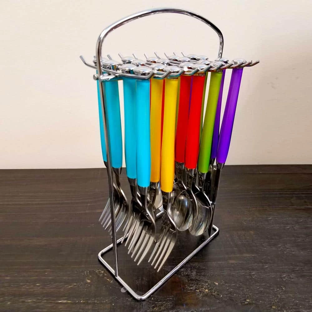 Wow your family and friends with the Santero 20-Piece Stainless-steel Flatware Set. This contemporary set features high-quality stainless-steel construction with ergonomic and colorful plastic handles. It comes with a metal hanging rack for easy reaching and storage, as well as showing off this beautiful flatware set.
