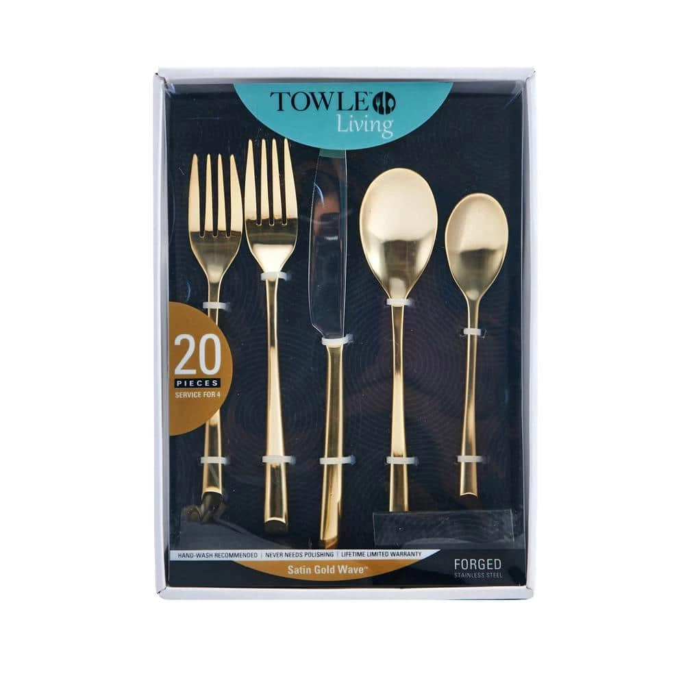 Breaking the standard flatware mold, this Towle Living Gold Wave 20-Piece Flatware Set features a sleek, smooth, gold finish with dramatic “cut-away ends” and one unique accent; the knife features a contrasting silver blade. Elegant and fashionable, this modern design will add style to your table for years to come. Constructed of superior quality 18/0 stainless steel. 20-piece set includes 4-each of: dinner knife, dinner fork, dinner spoon, teaspoon and salad fork. Dishwasher safe.